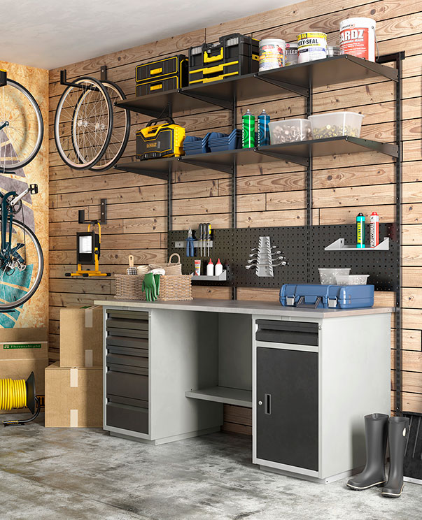 Гардеробные системы для гаража изготавливаются из прочных материалов, устойчивых к механическим повреждениям. Это гарантирует их долговечность и безопасность при хранении тяжелых инструментов и оборудования.