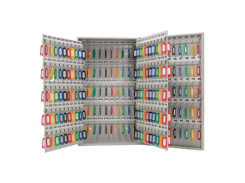 В ключнице 300 металлических крючков для удобного хранения ключей. В комплекте идут пластиковые цветные брелоки и самоклеящиеся номерки — по одному на каждый крючок.