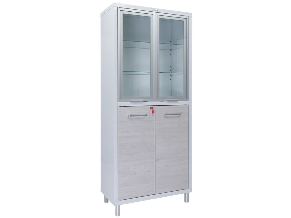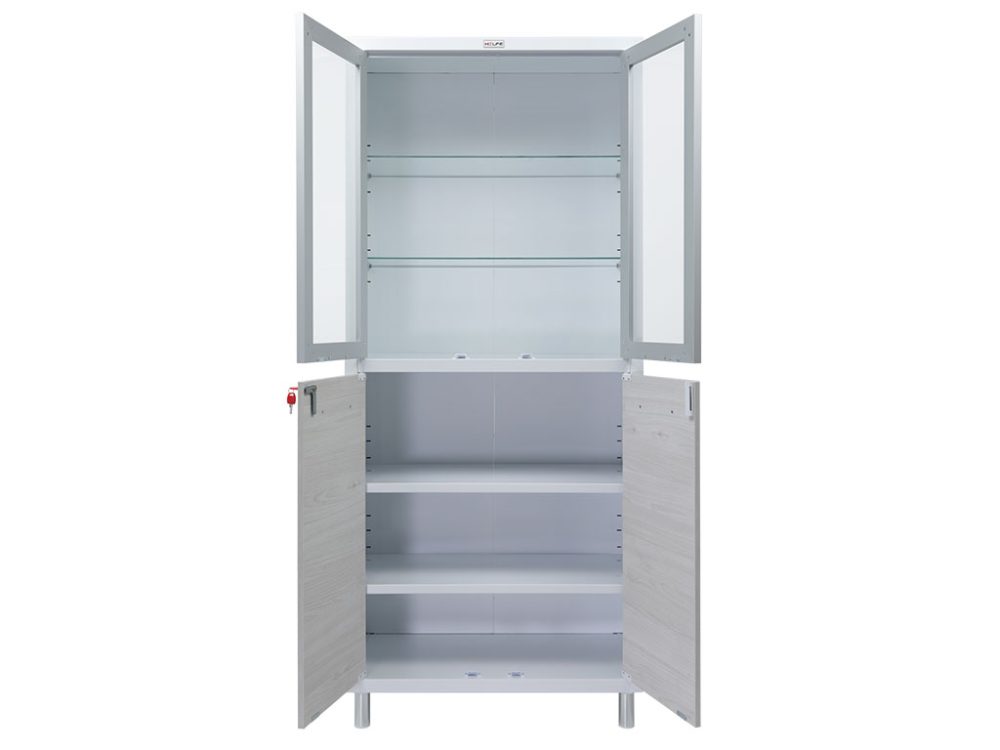 Шкаф оснащен ключевым замком HILFE с 2000 комбинациями, гарантирующим высокий уровень защиты от несанкционированного доступа. Это важно для безопасного хранения лекарств и конфиденциальной информации.