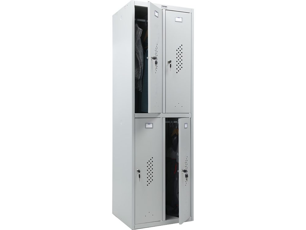 Среди преимуществ шкафа: вентиляционные отверстия на дверях снизу и сверху, специальные зацепы на боковых стенках для скрепления локеров, возможность навесить двери справа или слева с односторонним или распашным открыванием. Это делает шкаф удобным для помещений любого типа и размера.