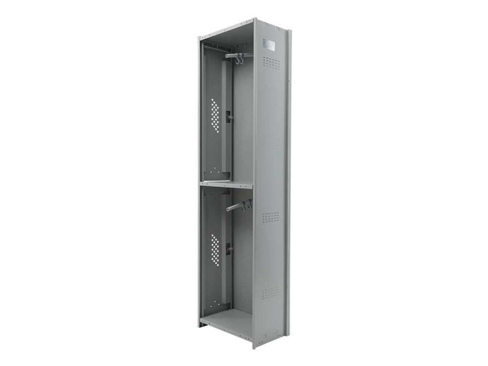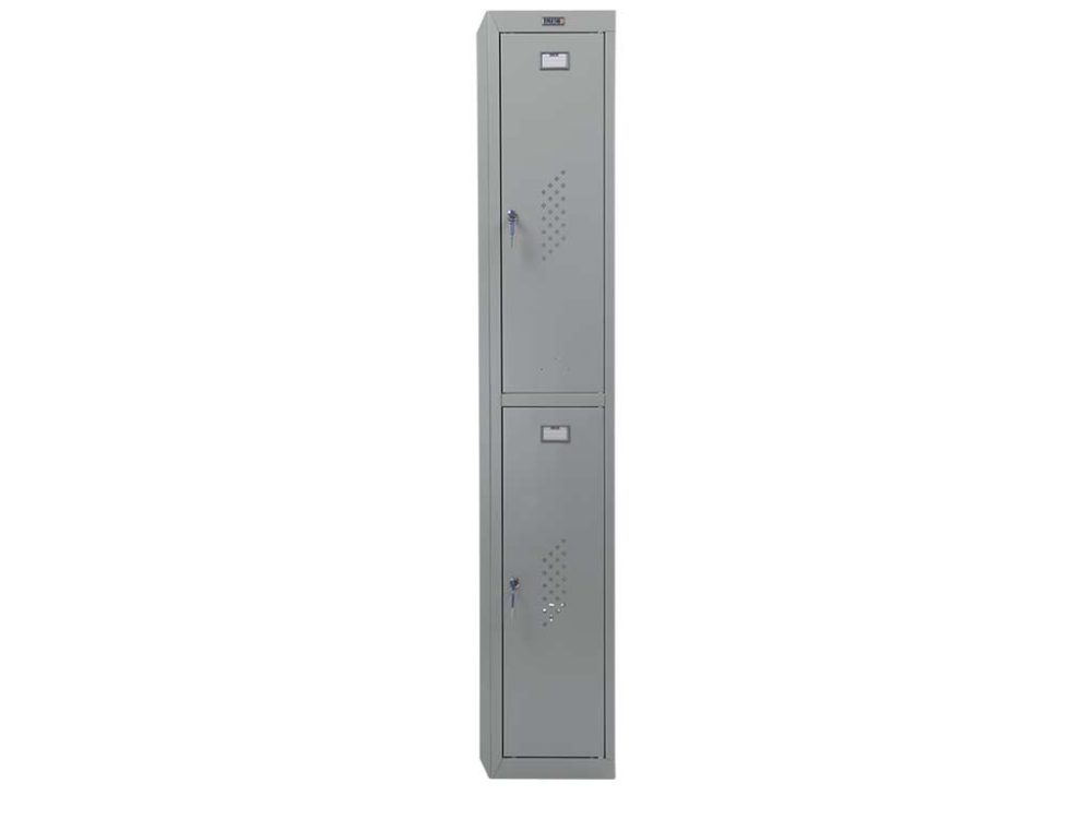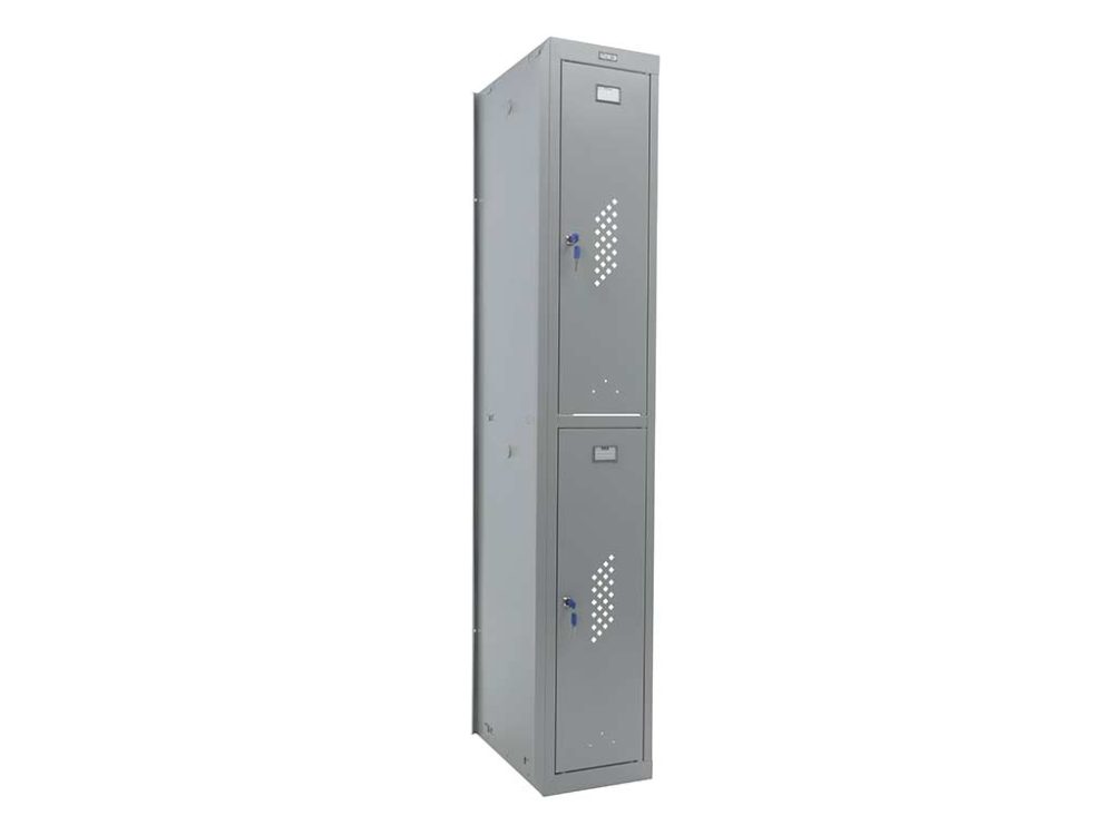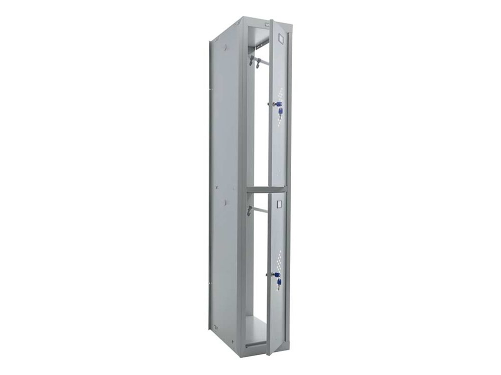 Шкаф разделен на две секции с отдельными запирающимися дверями. В дверях есть вентиляционные отверстия снизу и сверху.