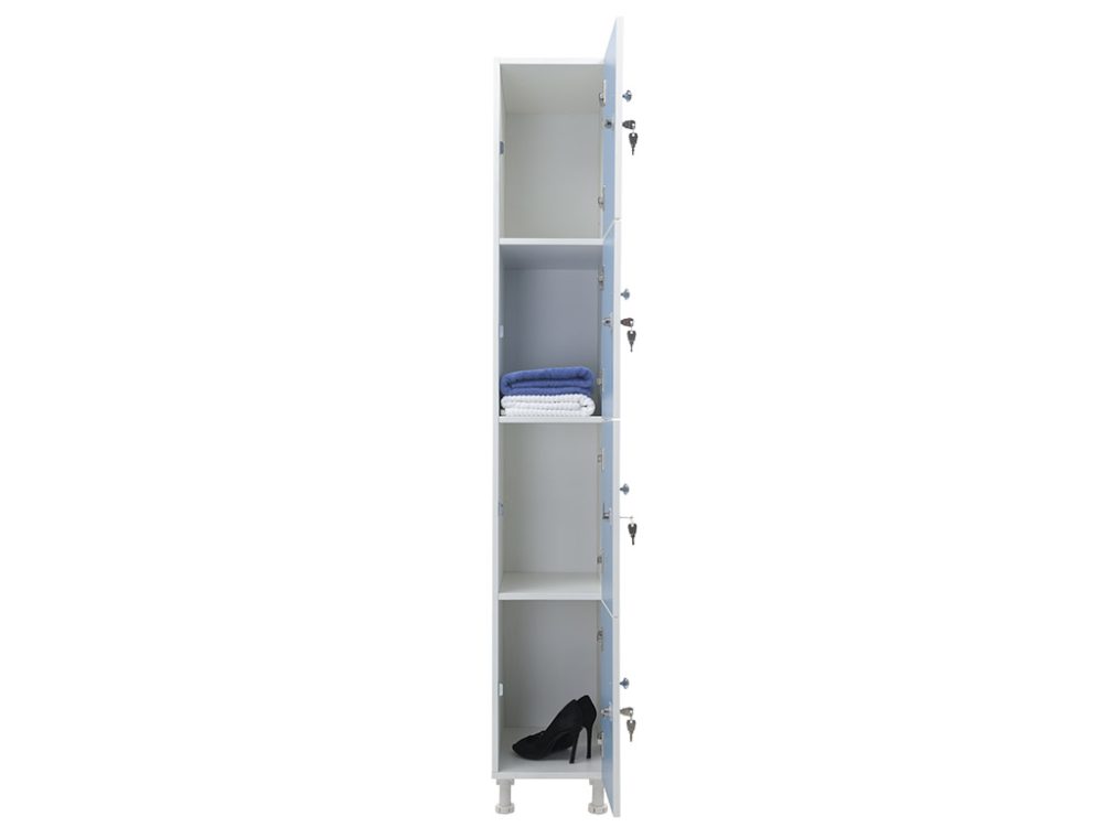 - Современный дизайн: Полимерное покрытие в голубой и белой цветовой гамме придает шкафу современный вид, а также повышает его влагостойкость и термостойкость.