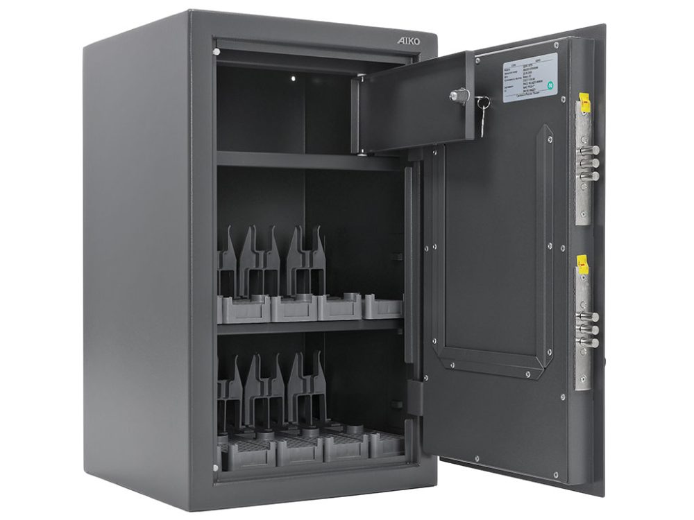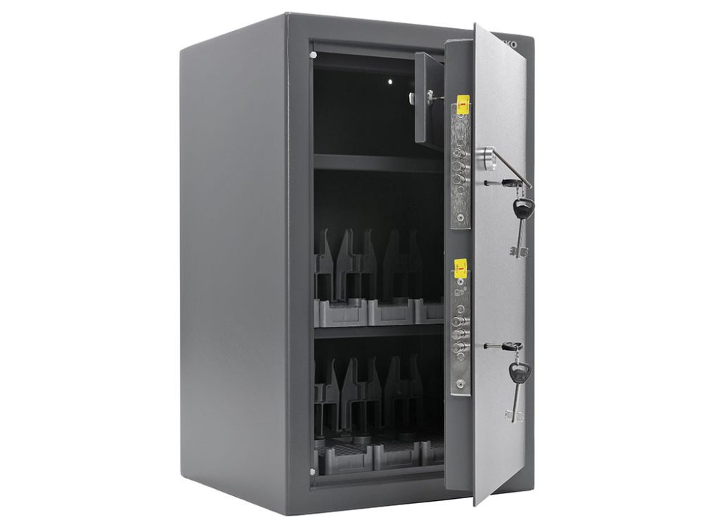 Шкаф сертифицирован по классу устойчивости к взлому S2 по ГОСТ 55148-2012 и оснащен ключевыми сувальдными замками российского производства класса 2, что обеспечивает высокий уровень защиты от несанкционированного доступа.