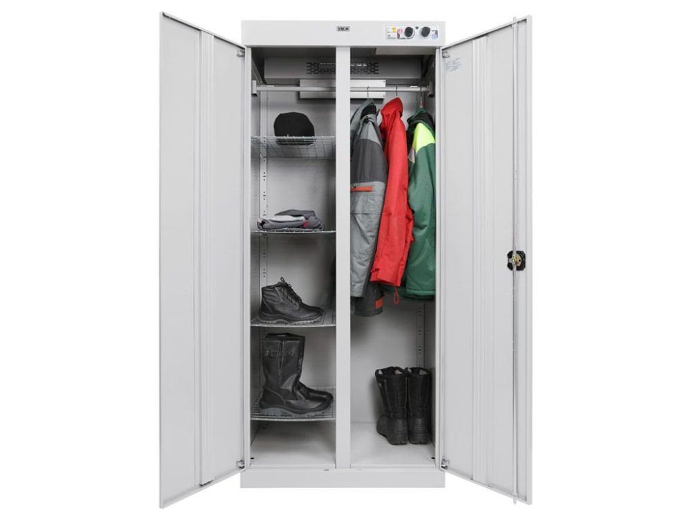 - Высокая производительность. Двухсекционная конструкция позволяет быстро и качественно сушить комплекты одежды, головных уборов, рукавиц, униформы, обуви и других предметов. Эффективная система вентиляции обеспечивает равномерное распределение тепла.