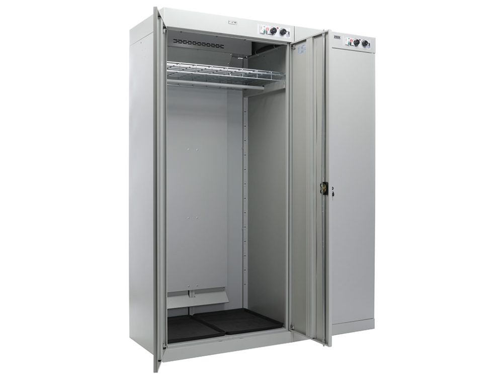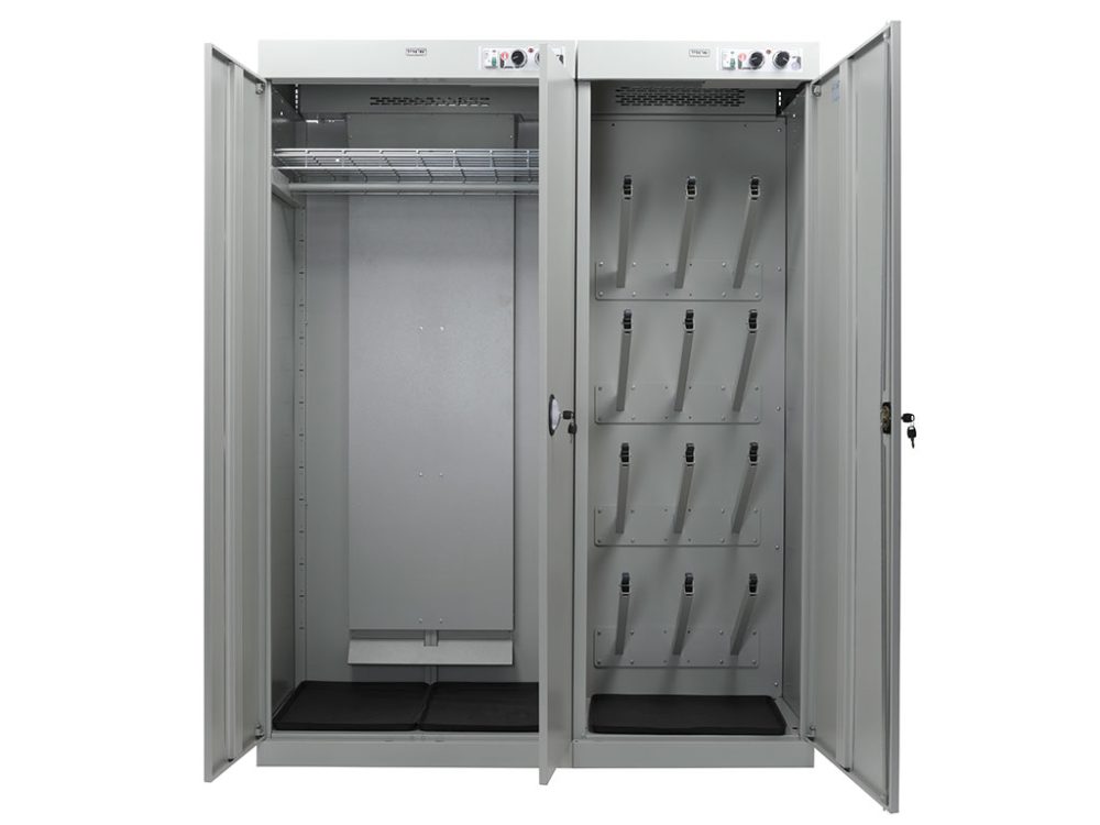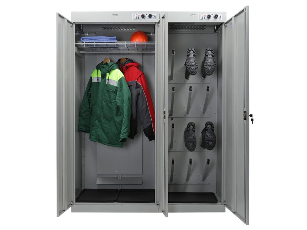 - Высокая производительность. Двухсекционная конструкция позволяет быстро и качественно сушить комплекты одежды, головных уборов, рукавиц, униформы, обуви и других предметов. Эффективная система вентиляции обеспечивает равномерное распределение тепла.