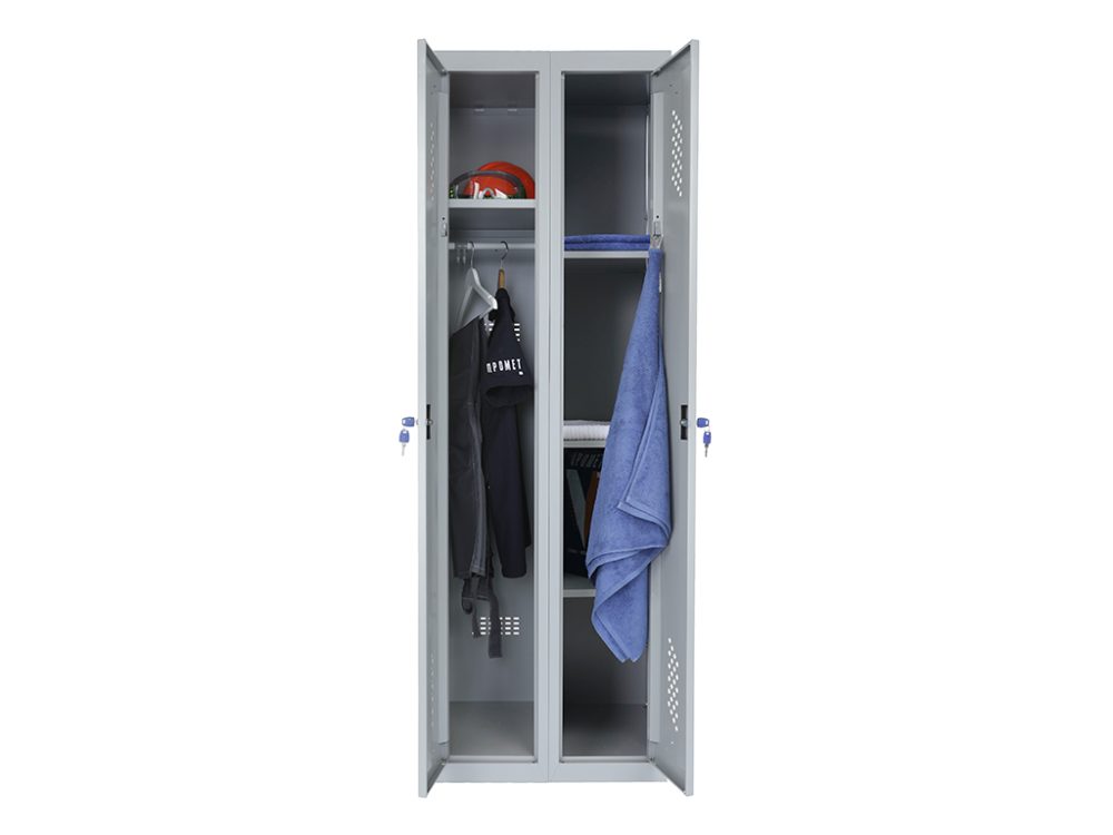 Конструкция шкафа ML-21-60 U отличается повышенной надежностью. Жесткий корпус, усиленный сварной рамой, обеспечивает устойчивость к механическим воздействиям и гарантирует долгий срок службы. Вертикальная сборка с использованием зацепов, саморезов и винтов делает конструкцию прочной и надежной. Встроенный ключевой замок «Практик» с 2000 комбинациями обеспечивает безопасность хранимых вещей. Вентиляционные отверстия в дверях и задней стенке поддерживают оптимальный уровень вентиляции, предотвращая появление неприятных запахов и сохраняя вещи в идеальном состоянии.