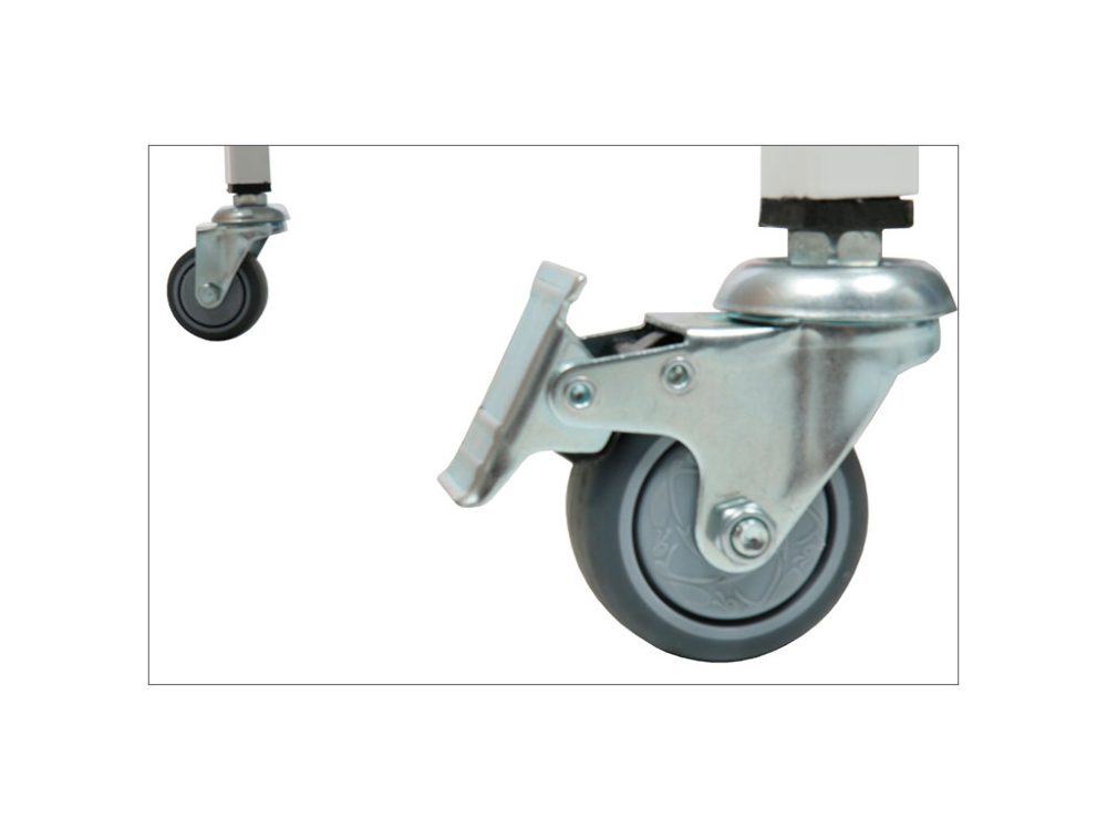 - Мобильность. Четыре колеса из прочного пластика облегчают перемещение стола. Два колеса оснащены стопорами для фиксации на месте.