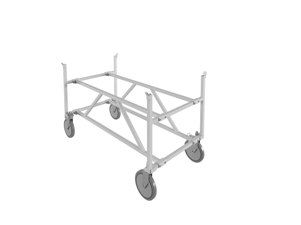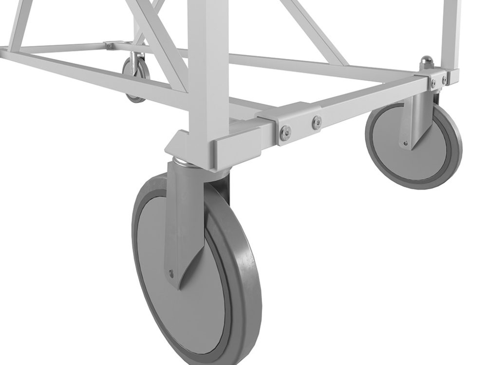 - колеса поворотные, самоориентирующиеся, ∅ 200 мм, из немаркой серой резины, не оставляющего следов на полу, два колеса — с индивидуальным тормозным устройством